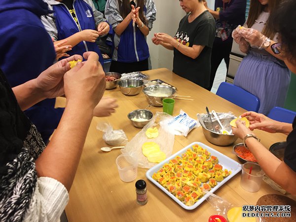 瑞豐義工團都馬上動手,聽從導師指示分工,先包燒賣和臘腸卷。