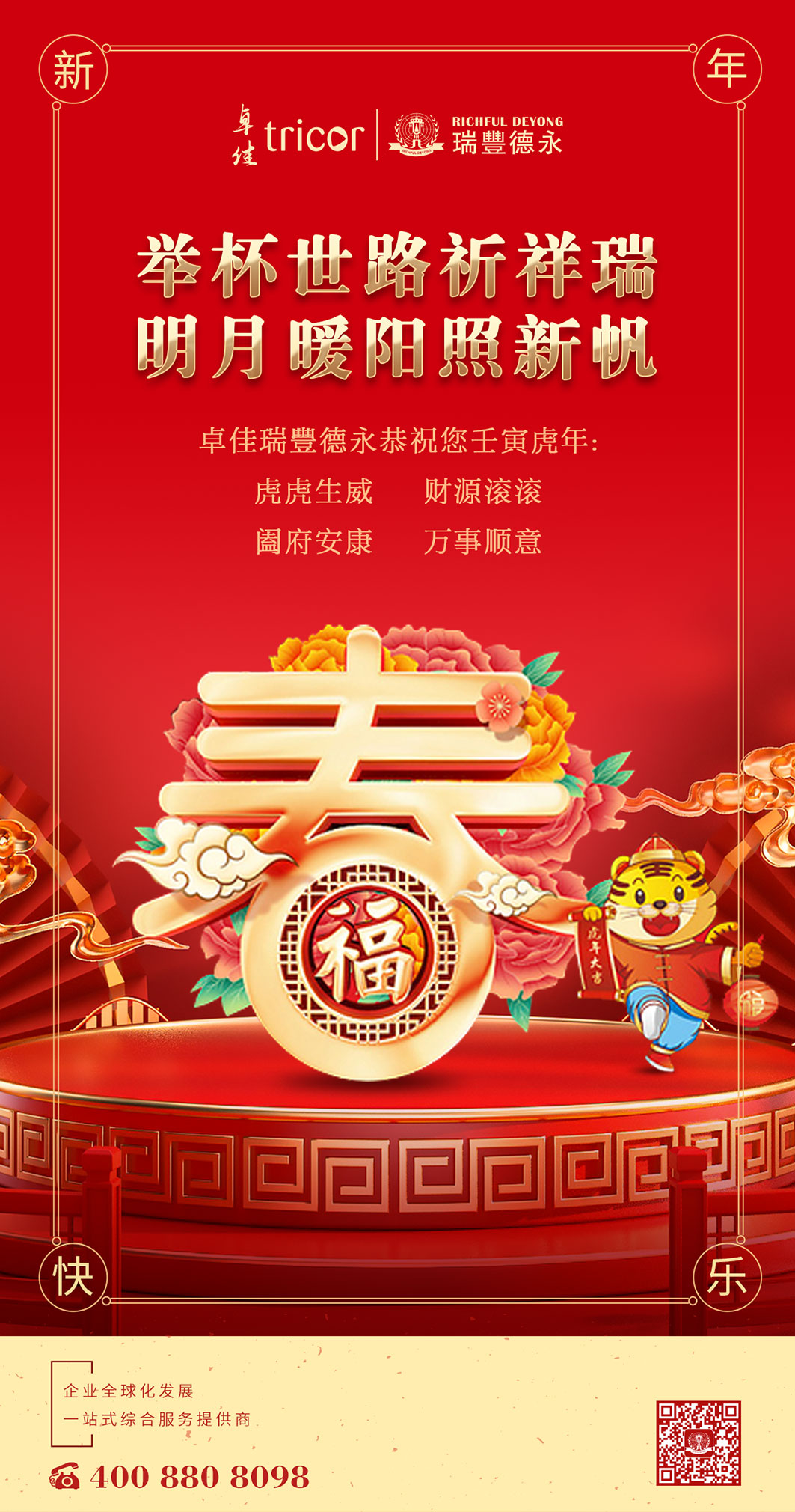 盛世千家樂 新春百業(yè)興。恭祝您在新的一年里:身體安康、闔家幸福,如虎添翼,續(xù)創(chuàng)輝煌!