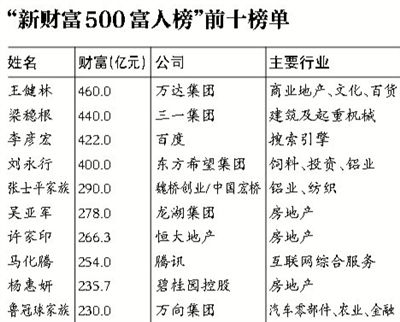 《新財富》雜志今天發(fā)布新一屆“新財富500富人榜”,萬達集團的王健林以460億元的財富成為今年首富,梁穩(wěn)根、李彥宏二人緊隨其后。值得注意的是,其中一位新上榜女富豪由“離婚成就”,其夫家三一集團更是創(chuàng)下八人上榜的富豪神話。此外,房地產依然是首富身價最高的行業(yè),區(qū)域財富差距明顯。今年的“新財富500富人榜”由中國民生銀行私人銀行特約發(fā)布。
