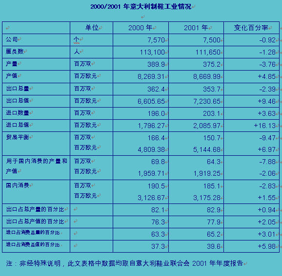 2000年是意大利制鞋業外貿狀況開始好轉的一年,直到2001年上半年其出口仍保持了增長的勢頭,前6個月出口數量同比增長7.8%。2001年下半年,由于國際市場需求銳減,致使意大利鞋業出口遭到重挫,全年出口呈負增長。