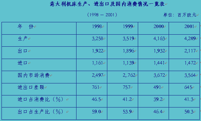 意大利目前有機(jī)床生產(chǎn)企業(yè)約450家,機(jī)床經(jīng)營(yíng)企業(yè)約120家。近幾年來(lái),意大利機(jī)床生產(chǎn)量逐年增加,產(chǎn)值1998年為32.58億歐元,1999年為35.19億歐元,2000年為41.63億歐元,2001年為42.09億歐元。2001年與1998年相比產(chǎn)量增加29.19%。意大利機(jī)床的出口約占生產(chǎn)總量的半數(shù)以上(詳看附表)。意大利國(guó)內(nèi)機(jī)床需求量1998年為24.97億歐元,1999年為27.62億歐元,2000年為36.72億歐元,2001年為35.64億歐元。