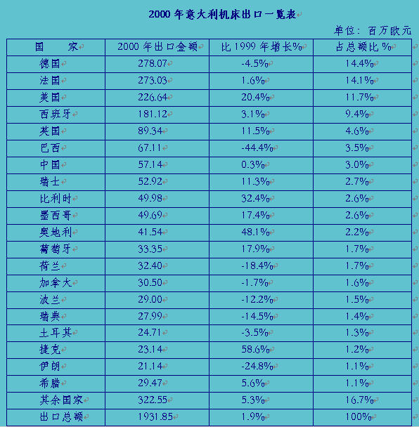 意大利是世界機(jī)床出口大國(guó)之一,以2000年為例,機(jī)床出口總額為19.31億歐元,占世界出口總量的8.35%,居世界第四位(前三位是:日本、德國(guó)、瑞士)。意大利機(jī)床出口的前十位國(guó)家是(按照金額大小順序排列)德國(guó)、法國(guó)、美國(guó)、西班牙、英國(guó)、巴西、中國(guó)、瑞士、比利時(shí)、墨西哥。僅前6個(gè)國(guó)家(1998至2000年)平均出口額就達(dá)到總出口額的55%以上,分別為1998年53.9%,1999年59.4%,2000年57.7%。中國(guó)連續(xù)三年排名第7位,1998年金額為6067.23萬(wàn)歐元,占總金額3.2%,比1997年下降33.7%;1999年金額為5694.76萬(wàn)歐元,占總金額3%,比1998年下降7.7%;2000年金額為5714萬(wàn)歐元,占總金額3%,比1999年增長(zhǎng)0.3%。