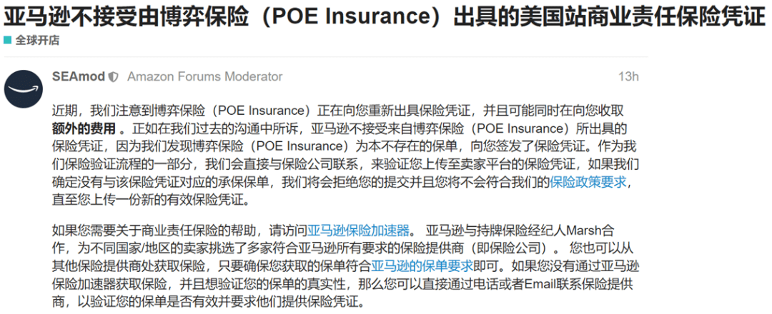 美國站的賣家們請特別注意!亞馬遜不接受來自博弈保險(POE Insurance)的保險憑證。