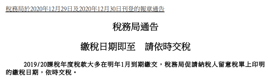 近期香港稅務局官網刊登了一則通告【繳稅期即至 請依時交稅】,2019/20課稅年度稅款在1月份即將到期繳納,提醒各納稅人留意稅單上的繳納日期,按時交稅。1月所剩時間已不多,瑞豐德永提醒相關納稅人注意時間節點。