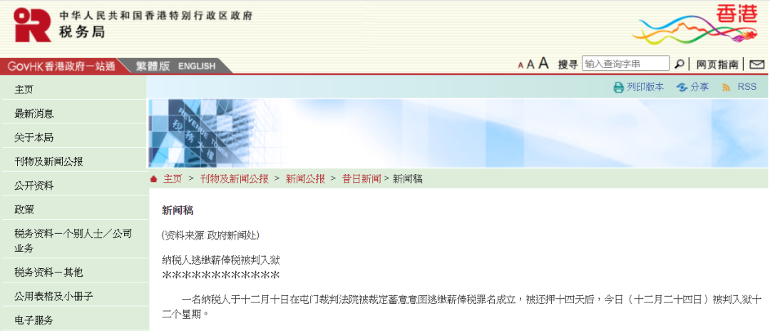 稅務局發言人提醒納稅人,《稅務條例》訂明逃稅是刑事罪行。一經定罪,每項控罪最高刑罰為入獄三年和罰款五萬元,另加一筆相等于少征收稅款三倍的罰款。 我們翻看稅務局官網,能發現稅務局會定期公布的關于相應逃稅違法行為的案例,比如在12月24日,香港稅務局發布了一則新聞公報 “一名納稅人被法法院裁定蓄意意圖逃稅罪名成立”。