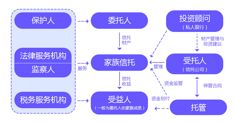 家族信托是以個人作為委托人,以家庭財富的管理、傳承、保護為目的的信托,通過資產(chǎn)管理、投資組合等理財服務(wù)實現(xiàn)對家族資產(chǎn)負債的全面管理,提供財富轉(zhuǎn)移、遺產(chǎn)規(guī)劃、稅務(wù)策劃、婚姻財富管理、子女教育、家族治理、慈善事業(yè)等全方位的服務(wù),受益人一般為本家族成員。
