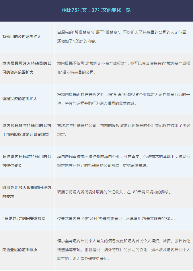 37號文在監管范圍、特殊目的公司范圍、境內居民境外投資、融資以及返程投資、股權激勵計劃登記、各項登記程序、處罰依據與措施等方面均進行了較大調整。