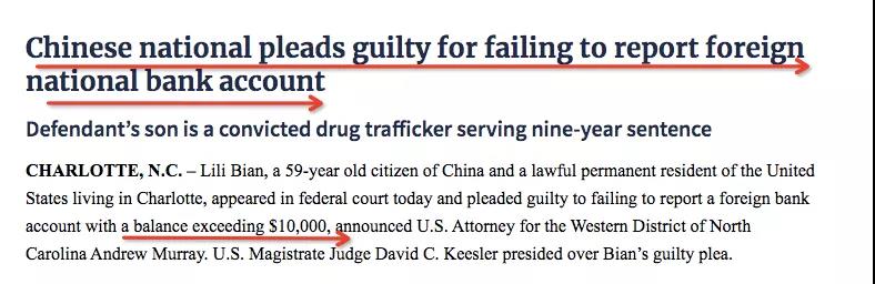 2019年7月8日,住在北卡夏洛特市的59歲中國公民Lili,出現在聯邦法庭認罪。她持有美國綠卡,承認在中國境內某金融機構,有超過1萬美元的賬戶,且未向財政部上報外國銀行和金融帳戶表格(ForeignBankandFinancialAccountForm,FBAR),繼而遭到聯邦起訴。在北卡西區聯邦法院出庭,等待她的是最高五年監禁和25萬元罰款。認罪后,被迫上繳了自己和兒子名下多處房產、豪華汽車和...