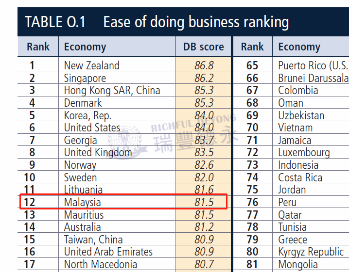 根據世界銀行《2020年全球營商環境報告》(Doing Business 2020)顯示,馬來西亞營商環境在全球190個經濟體中排名較去年上升3位,列第12位,在東盟地區僅次于新加坡。