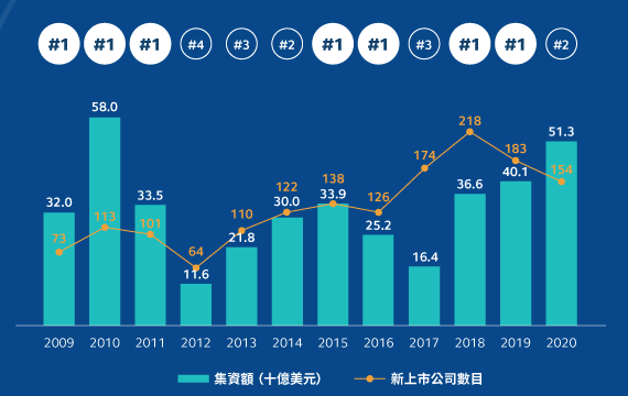 2020年盡管環球市場波動異常,但是港交所的一級市場仍領先全球IPO集資榜,共有154家公司在香港交易所上市,2020年首次公開招股集資額位列全球第二,集資金額達3,975億港元,是2010年以來最高。