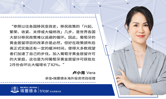 面對(duì)葡萄牙2月黃金居留許可大幅增長的數(shù)據(jù),瑞豐德永海外投資項(xiàng)目經(jīng)理盧小青女士分享了她對(duì)當(dāng)前葡萄牙投資移民形勢的見解。