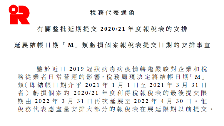 根據(jù)具體的結(jié)賬日不同可延期的時(shí)間也有所區(qū)別,另外由于現(xiàn)在稅局疫情影響,M類虧損的公司提交稅表的時(shí)間已經(jīng)由到2022年3月31日再次延續(xù)到2022年4月30日了。