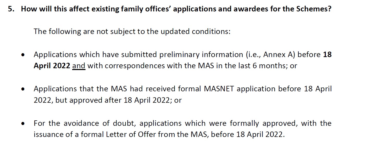 這兩天也陸續(xù)收到已辦理完成的老客戶問詢新政策是否會對他們的家族辦公室有影響,以下是新加坡金融管理局的官方回答: