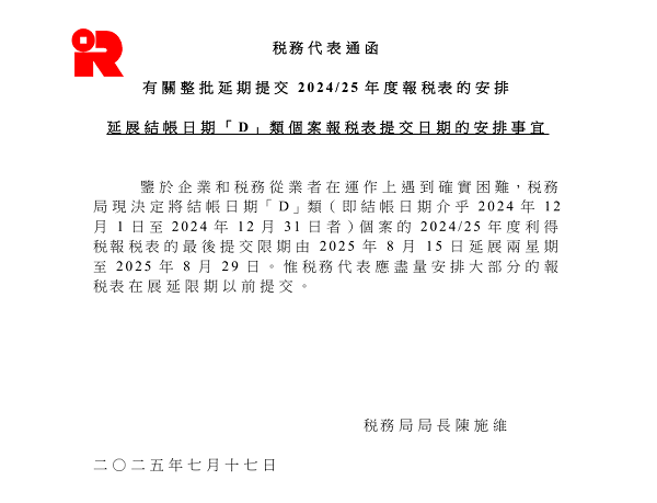 香港稅務(wù)局于2025年7月17日發(fā)布通告,鑒于企業(yè)與稅務(wù)服務(wù)機(jī)構(gòu)的年底結(jié)賬操作困難,正式延長D類公司(財務(wù)年度結(jié)束于2024年12月1日-31日)的利得稅申報期限——由原定的2025年8月15日延后兩周至2025年8月29日。本次延期旨在緩解申報壓力,但需注意8月29日為最終截止日,逾期將面臨合規(guī)風(fēng)險。