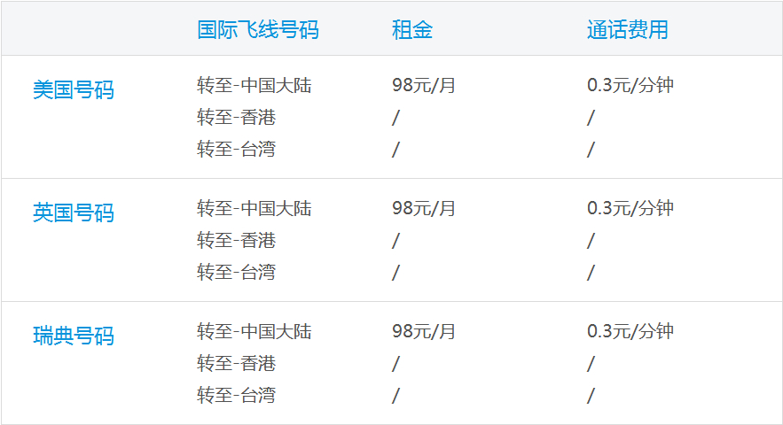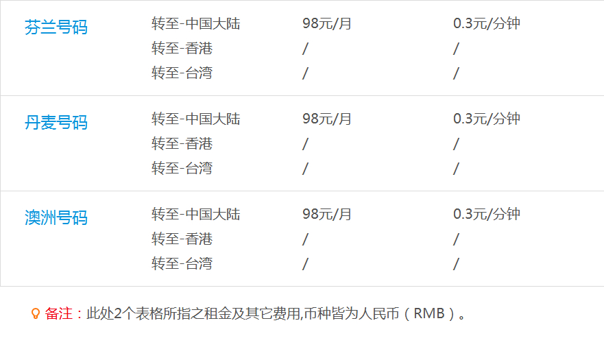 國際飛線資費 ( 表中" / "為同上的意思)
